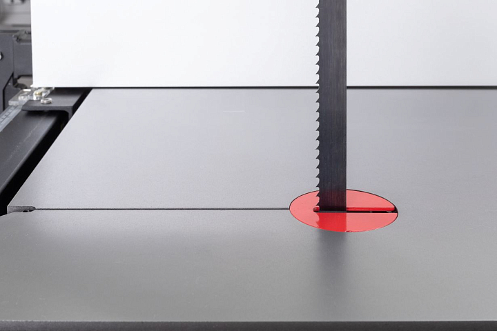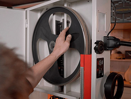 Натяжение ленты на колесах одним движением рычага. Большая ширина шкивов дает возможность установки широких пильных лент. Направление ленты при пилении двумя группами трехроликовых направляющих на шарикоподшипниках. Одна группа роликов расположена прямо над заготовкой и вторая – под столом. Стрелочный индикатор уровня натяжения поможет выбрать предварительный натяг пильной ленты. Отрегулировать натяжение до требуемого можно при помощи маховика на корпусе пилы под верхним/ведущим шкивом. Через смотровое окно необходимо проследить при первичной установке за сбеганием ленты. Лента должна находиться по центру и сбегание ее в любую из сторон недопустимо. Плавность хода и пиление без вибраций обеспечат чугунные шкивы с массивным телом. Они отбалансированы на заводе-изготовителе с использованием стендов компьютерной балансировки.