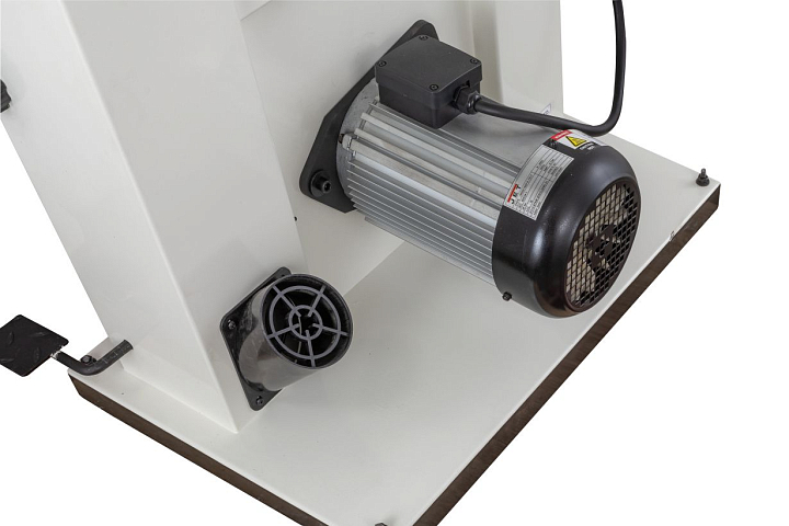 Рабочий стол чугунный. Трапеция опорно-поворотной цапфы также чугунная. Поворотные полукольца – стальные, из действительно толстой стали, мощные и устойчивые к вибрациям и износу. Наклон производится при помощи зубчатого механизма вращением рукоятки в обе стороны (на 5° в сторону станка и на 45° от него). Эффективное пылеудаление с обеих сторон ведущего колеса. Устроено оно двумя 100-миллиметровыми патрубками: один под рабочей поверхностью, второй в нижней части корпуса.